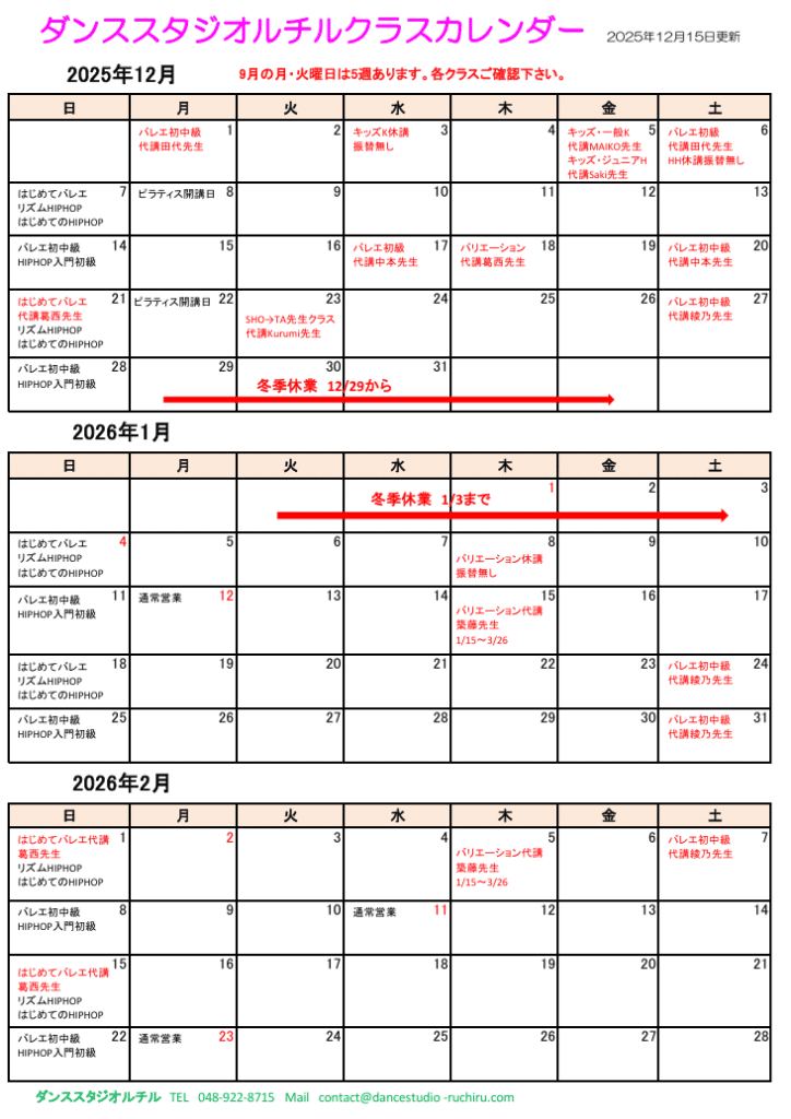 12/21・2/1・2/15 → 代講 葛西仁黎花先生