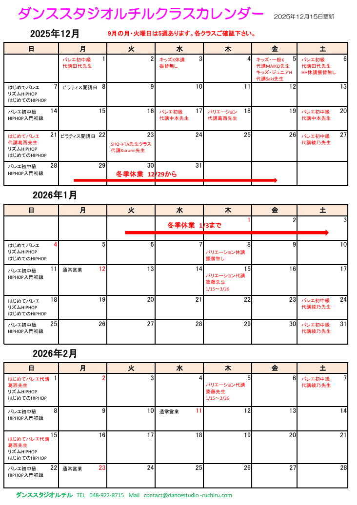 ※5週目は、お子様クラスは基本的にお休み、一般クラスは有りですが、各クラス講師にご確認下さい。