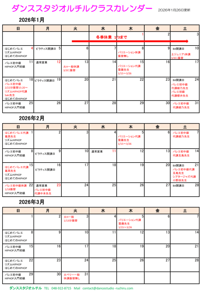 1/13 休講 → 3/3 振替(3月は5週あります)