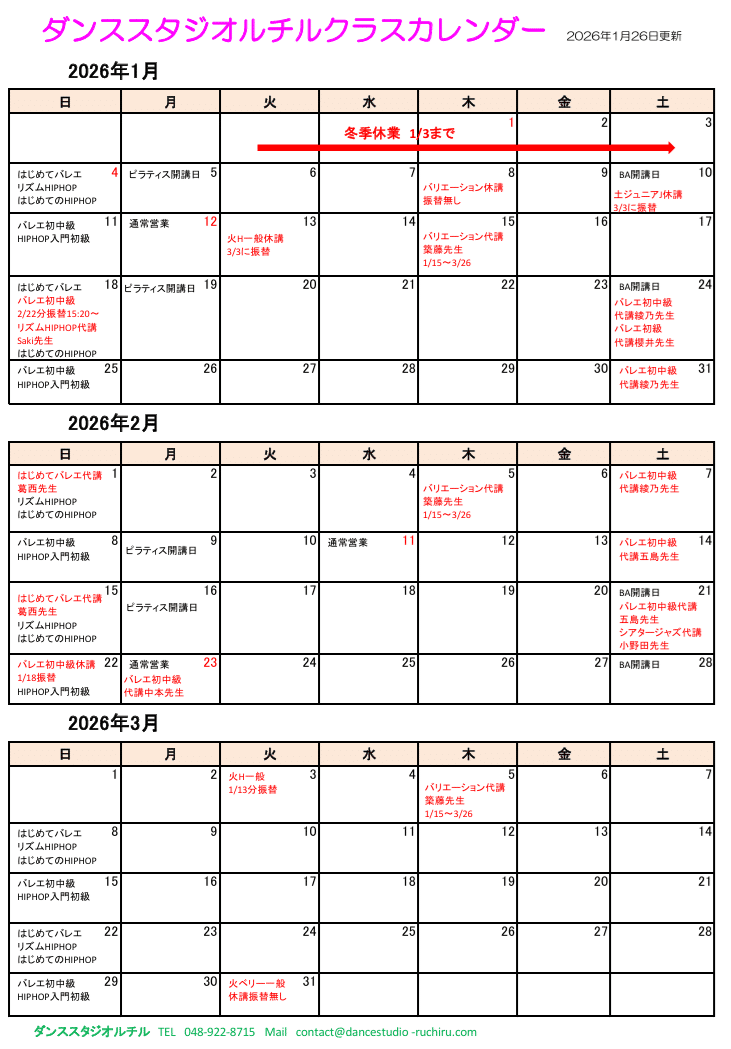 1/13 休講 → 3/3 振替(3月は5週あります)