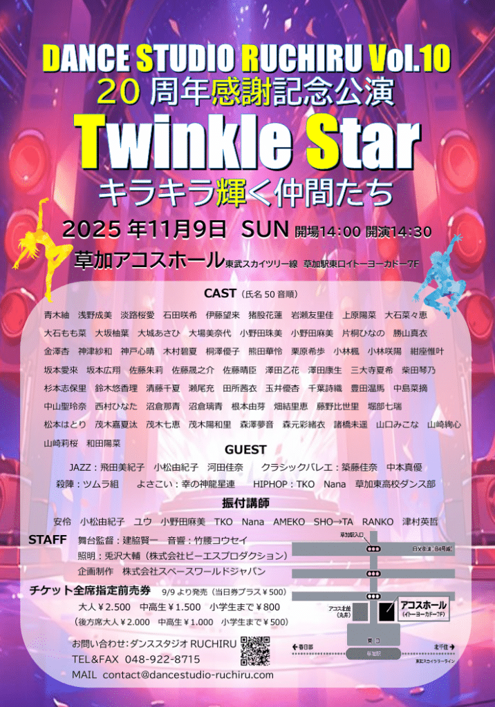 2025年9月10日 / 最終更新日時 : 2025年10月1日 ruchiru ダンススタジオルチルVol,10 20周年感謝記念公演 ダンススタジオルチルVol,10 20周年感謝記念公演を開催致します! 日時:11月9日(日)開場14:00 開演14:30 場所:草加アコスホール 今回は20周年の記念すべき公演で、ゲストもたくさん登場! ぜひ皆様お越し下さい♪